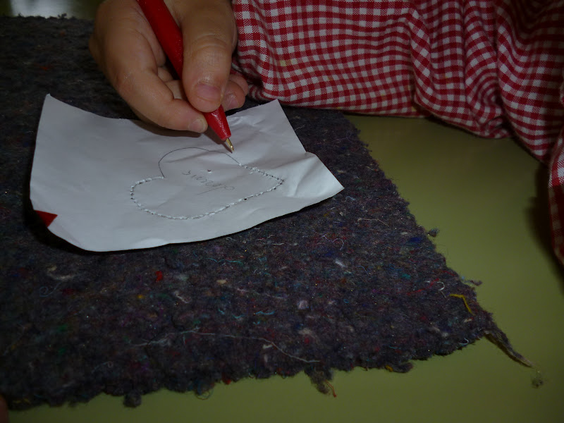 Os de 3 anos despois de escribir, picar e pegar un gran corazón na postal, pegárona en papel reciclado de agasallo e logo nunha cartolina.
